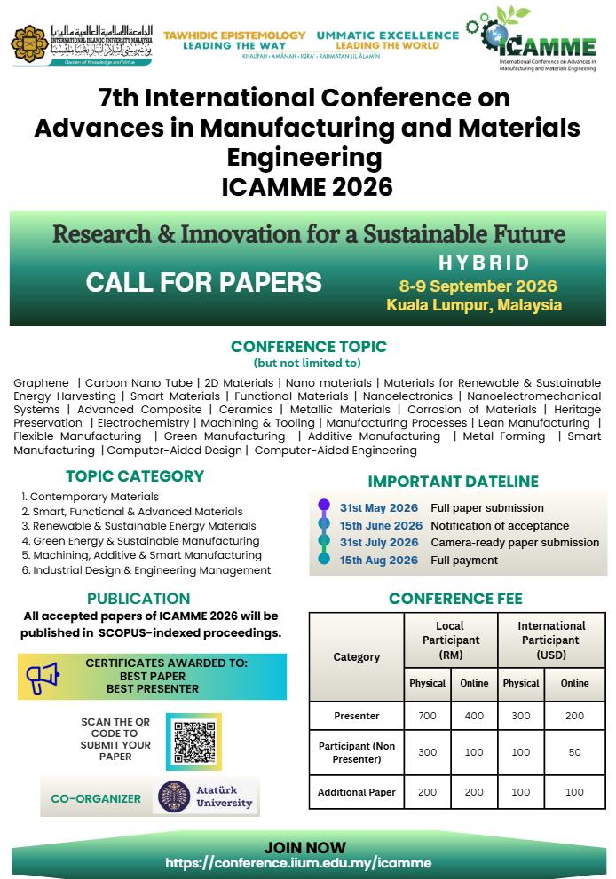 7th International Conference on Advances in Manufacturing and Materials Engineering (ICAMME) 2026 is a series of conference organized by the Faculty of Engineering, International Islamic University Malaysia (IIUM) and the Department of Manufacturing and Materials Engineering, as a part of IIUM Engineering Congress (IEC) 2026. ICAMME 2026 involves keynote speech by prominent researchers from Manufacturing and Materials Engineering field, and oral contributions by participants.