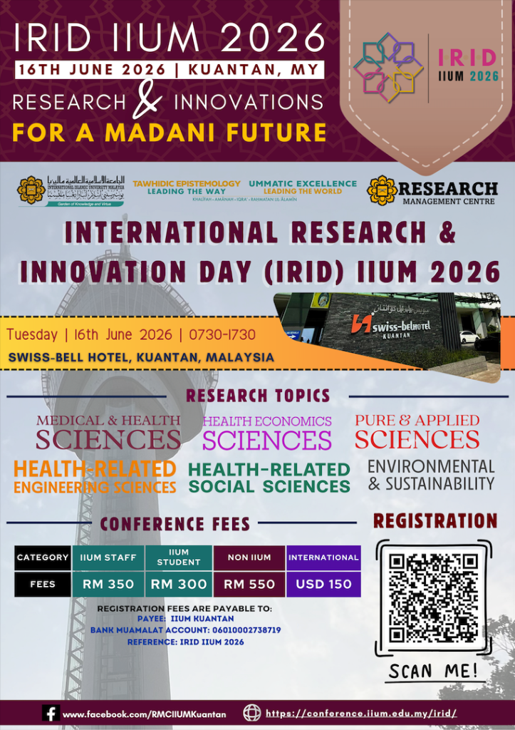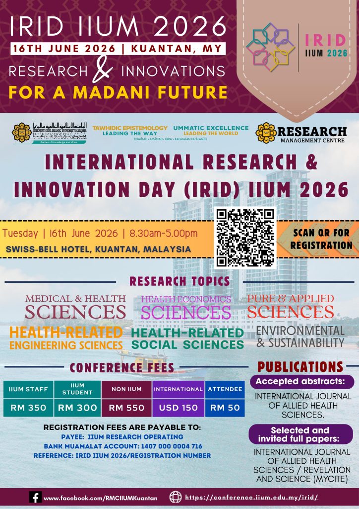 Visitors can look forward to inspiring keynote sessions, poster and oral presentations, research exhibitions, and opportunities for networking and partnership building. IRID 2026 aims not only to celebrate the achievements of IIUM researchers but also to catalyse new research directions and foster a collaborative ecosystem that supports Malaysia’s aspirations in research and innovation.