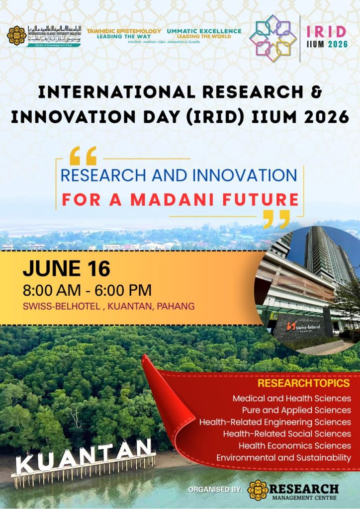 The International Research and Innovation Day (IRID) IIUM 2026 is a premier event hosted by the Research Management Centre of the International Islamic University Malaysia. Since its inception in 2016, IRID has grown into an important platform that brings together academicians, researchers, postgraduate students, industry partners, and research institutes to share groundbreaking discoveries and innovative ideas.